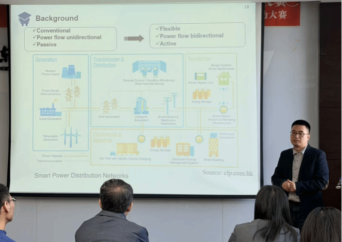 报告会上,龙超老师围绕数字能源与分布式能源管理的融合发展趋势,结合学科前沿动态与自身实践经验展开深度分享。首先,他立足自身在英国的留学与科研经历,系统阐释了机器学习与深度强化学习在提升电力系统智能化水平中的核心价值,通过实际案例呈现了数据驱动方法为电力系统优化调度、安全控制等领域带来的范式变革;然后,聚焦电动汽车规模化接入这一行业热点,从负荷预测精度提升、灵活调节机制构建及市场交易模式创新等维度,深入剖析了新型扰动下电网运行面临的关键挑战,并指明了相关前沿研究方向;最后,结合学科融合发展趋势,为在场师生的学业深造与职业规划提供了中肯建议,还分享了自身发表顶刊论文的亲身经验,从选题创新、实验验证到学术写作的全流程拆解实用技巧,鼓励大家夯实专业基础、保持科研探索热情。